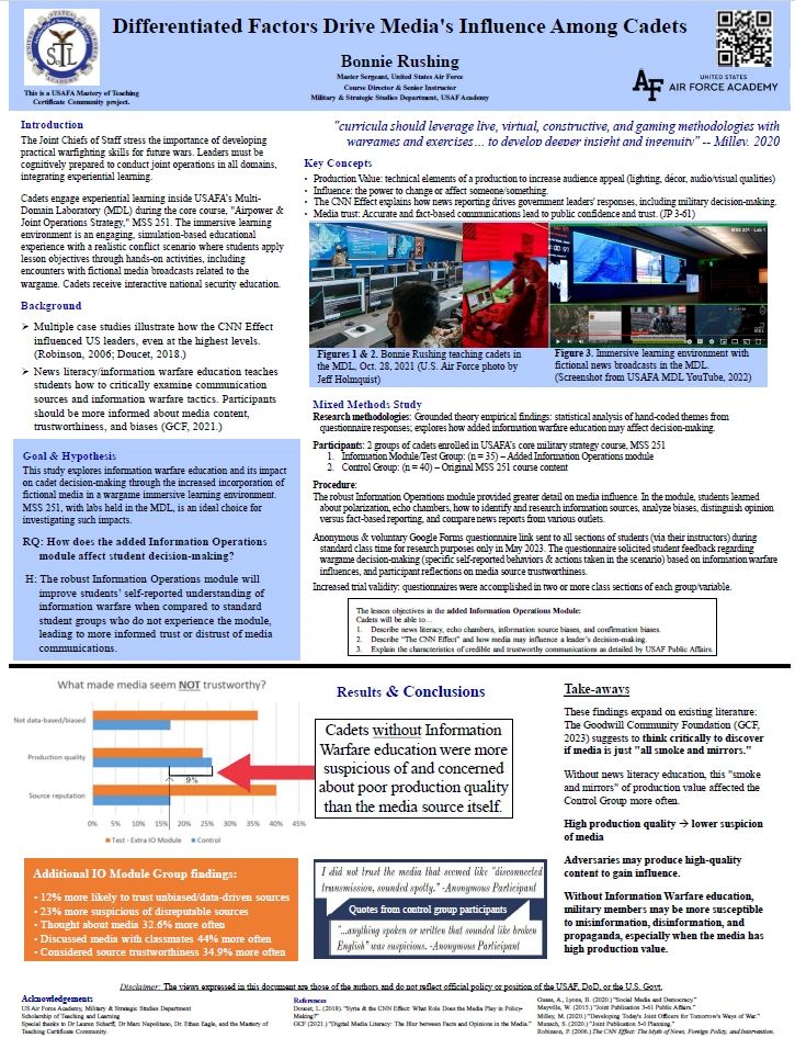 Rushing, B.L., "Differentiated Factors Drive Media Influence Among Cadets" Poster Presentation, US Air Force Academy, 2023.